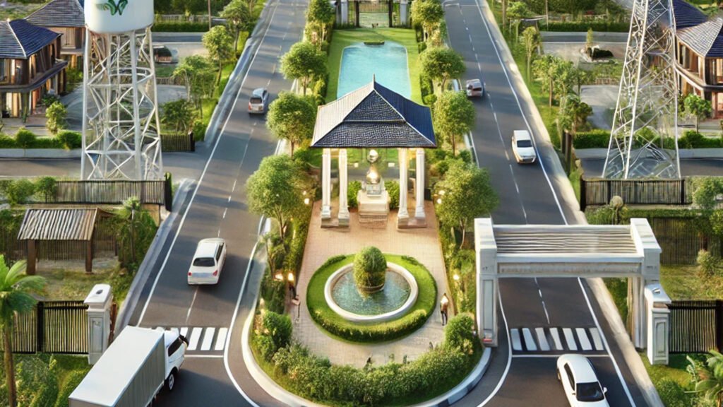 • Grand entrance arch • Landscaped open areas • Buddha statue • Children’s play area • Jogging track • Outdoor gym • Gazebo seating area • Indoor games zone • Cricket practice net • Water fountain • Community open space
