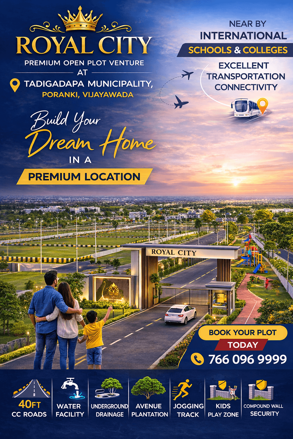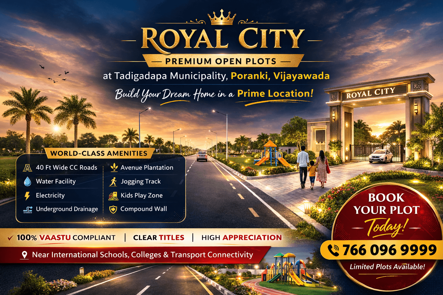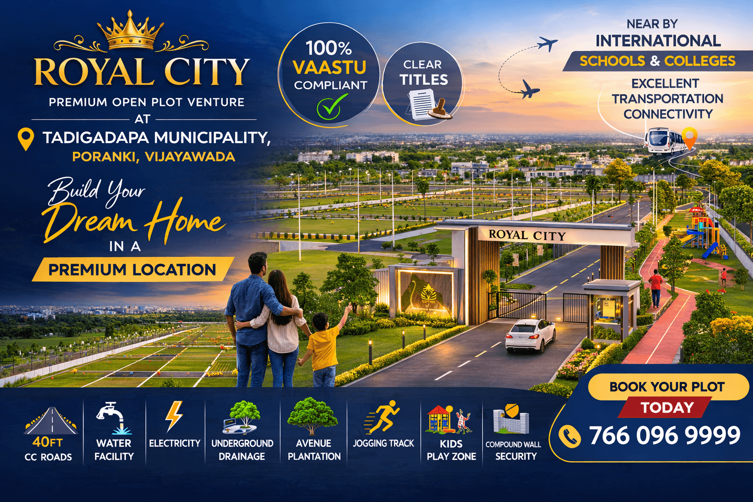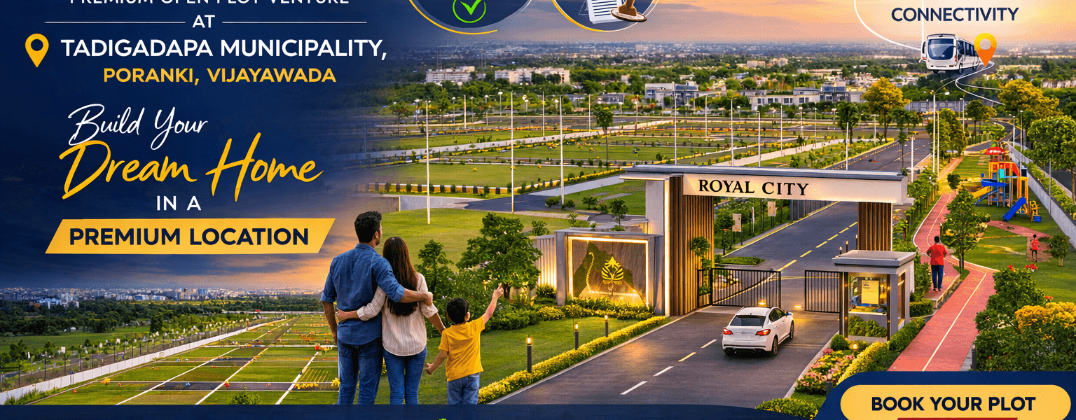 Welcome to Royal City, an exclusive open plot venture located at Tadigadapa Municipality, Poranki, Vijayawada — one of the fastest-growing residential hubs near the city.